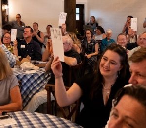 Recent Trekkers grad, Scout Bookham, raises her paddle at Fired Up, an annual fundraising event for Trekkers. July 2025.