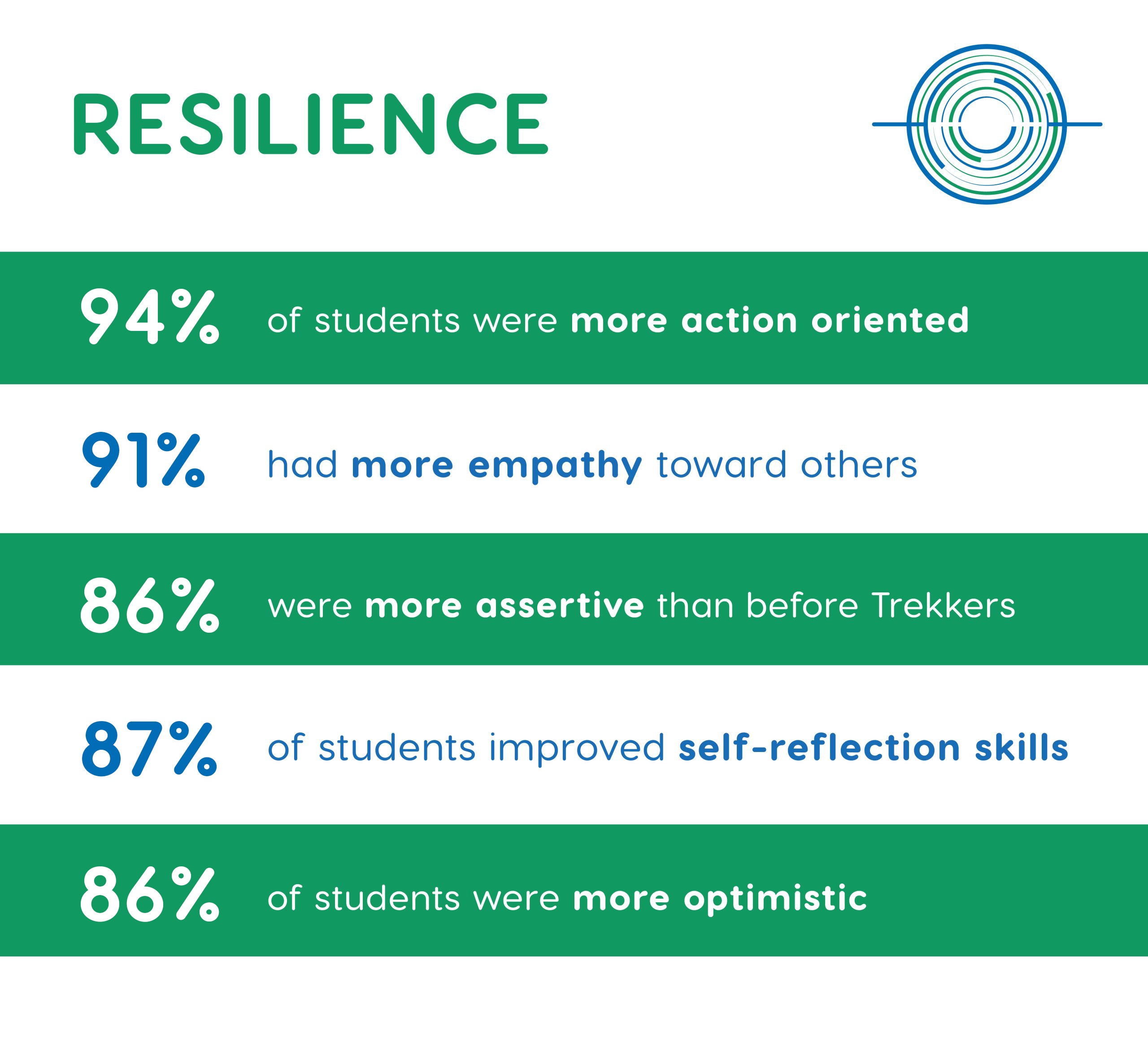 For over 25 years, Trekkers has provided positive relationships and experiences for young people to develop into thriving adults. In partnership with The Pear Institute, an external evaluator, we measure our impact across three categories: Aspirations, Resilience, and Relationships.